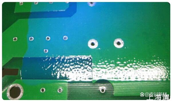 三防漆噴涂后,一般三防漆在PCB板自流平,有些自動(dòng)化的噴涂工藝流平是通過傳送帶的速度來控制放置時(shí)間,稀釋劑揮發(fā)快,粘度高,導(dǎo)致未流平的區(qū)域流不平,出現(xiàn)表面凹凸現(xiàn)象,也就是桔紋現(xiàn)象。