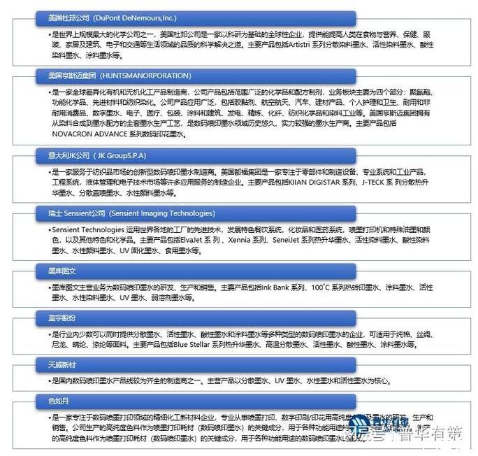 數(shù)碼噴印墨水市場呈現(xiàn)與數(shù)碼印花設備市場相近的市場競爭格局,由海外巨頭主導市場,如美國杜邦公司、美國亨斯邁集團、意大利JK公司等。從全球范圍來看,目前歐洲、北美地區(qū)的數(shù)碼噴印技術仍處于較高水平,是率先對數(shù)碼噴墨印花技術實現(xiàn)產(chǎn)業(yè)化的地區(qū),受益于較高的環(huán)保標準和豐富的時尚原創(chuàng)設計產(chǎn)業(yè),歐洲、北美地區(qū)的數(shù)碼印花產(chǎn)品供需旺盛,數(shù)碼噴印應用產(chǎn)業(yè)規(guī)模大且普及程度高,全球領先的數(shù)碼噴印墨水制造商多集中于此,亞太地區(qū)則以日本、韓國制造商為主。我國的數(shù)碼噴印墨水行業(yè)起步較晚,企業(yè)規(guī)模、研發(fā)能力以及產(chǎn)品穩(wěn)定性等方面參差不齊,且主要以中小型企業(yè)為主,但隨著最近幾年國產(chǎn)數(shù)碼噴印墨水的快速發(fā)展,我國也出現(xiàn)了少數(shù)綜合實力相對較強的專業(yè)生產(chǎn)商。國內(nèi)外主要墨水生產(chǎn)商情況如下: