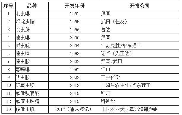 目前,在全球范圍內(nèi)開(kāi)發(fā)或已使用的新煙堿類農(nóng)藥主要有13種,詳細(xì)信息見(jiàn)表1。