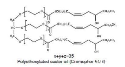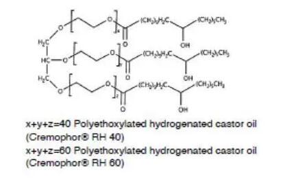 另一類重要的非離子表面活性劑是聚氧乙烯蓖麻油(Cremophor)或聚氧乙烯氫化蓖麻油(Cremophor RH)。蓖麻油是蓖麻油甘油三脂,與環(huán)氧乙烯反應,親水性的氧化乙烯結構便插入到蓖麻酸和甘油之間,便得到了聚氧乙烯蓖麻油,如果蓖麻油中的雙鍵加氫飽和后,再與環(huán)氧乙烯反應,那么得到的便是聚氧乙烯氫化蓖麻油。環(huán)氧乙烯和蓖麻油的反應位點是隨機的,因此得到的表面活性劑是一種混合物,也包括未反應的蓖麻油和均聚形成的聚氧乙烯。不同種類的聚氧乙烯蓖麻油或聚氧乙烯氫化蓖麻油是通過參與反應的氧化乙烯和蓖麻油或氫化蓖麻油的比例決定的,例如Cremophor EL 40或Cremophor RH 40,其中40代表的便是混合物中氧化乙烯和蓖麻油的摩爾比。這類表面活性劑的HLB一般在12以上,常用作難溶性藥物的增溶。