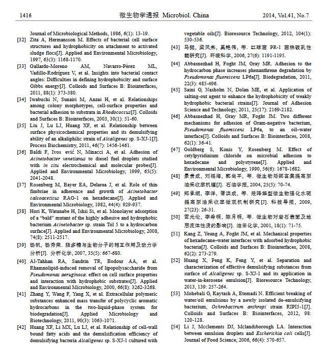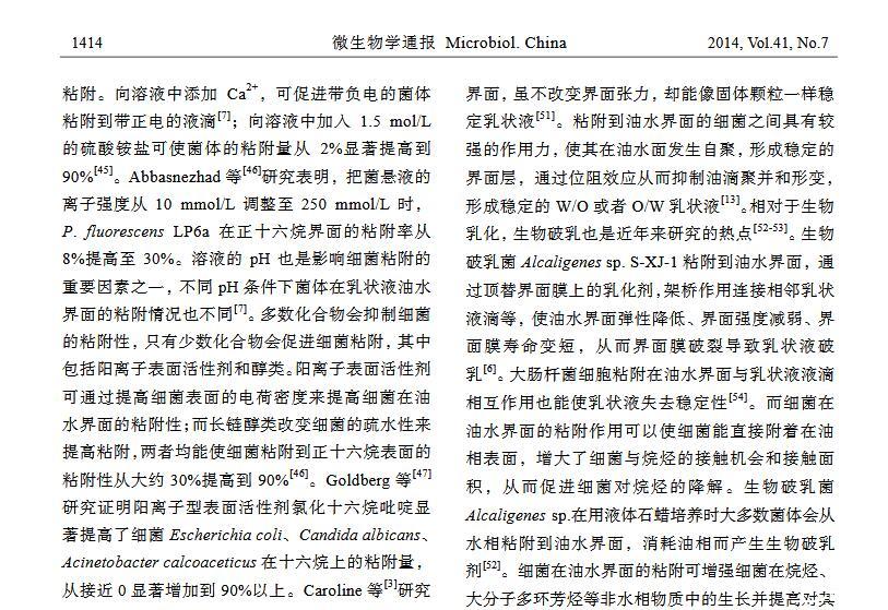 摘 要:細(xì)菌在油水界面粘附主要應(yīng)用于烷烴污染的環(huán)境修復(fù)、石油開(kāi)采與加工、食品加工等方面,其研究已經(jīng)引起各界的廣泛關(guān)注。本文基于 XDLVO 理論闡述細(xì)菌在油水界面的粘附機(jī)理;總結(jié)細(xì)菌表面特性、油相及水相性質(zhì)對(duì)細(xì)菌粘附的影響;介紹細(xì)菌粘附作用在微生物驅(qū)油、生物乳化與破乳以及烷烴降解方面的應(yīng)用,并對(duì)今后的研究方向提出展望。