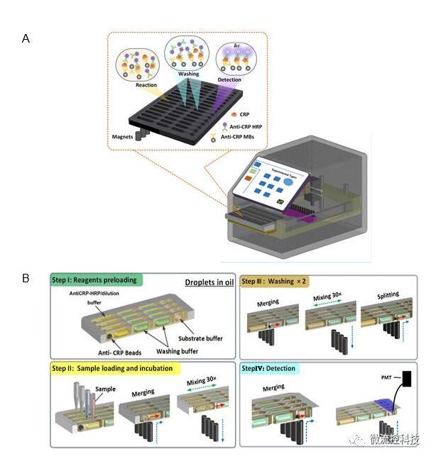 圖2液滴陣列微流控芯片免疫分析系統(tǒng)。A.分析儀器結(jié)構(gòu)示意圖;B.分析原理示意圖。