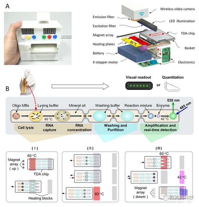 分子診斷是新興的檢驗(yàn)醫(yī)學(xué)領(lǐng)域。隨著熒光定量PCR的推廣,基因檢測(cè)技術(shù)在臨床醫(yī)學(xué)中得到了廣泛應(yīng)用。盡管如此,現(xiàn)有核酸分析平臺(tái)的一些不足之處還是限制了分子診斷技術(shù)的推廣:1)場(chǎng)地要求嚴(yán)格,試劑準(zhǔn)備、核酸提取和擴(kuò)增需要分別在獨(dú)立房間內(nèi)進(jìn)行,極大限制了該技術(shù)在醫(yī)療資源有限條件下的開展;2)采用離線式分析,操作復(fù)雜、分析周期較長(zhǎng),不利于應(yīng)對(duì)突發(fā)性事件;3)現(xiàn)有的熒光定量PCR方法多是針對(duì)單一指標(biāo)檢測(cè)設(shè)計(jì),對(duì)于多重基因檢測(cè)無論是操作繁瑣程度還是測(cè)試成本均是難以接受的。