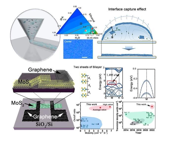 二維(2D)半導(dǎo)體材料為將摩爾定律擴(kuò)展到原子尺度提供了機(jī)會(huì)。與傳統(tǒng)基于蒸鍍和光刻技術(shù)的加工技術(shù)相比,印刷電子因成本效益、靈活性以及與不同襯底的兼容性而受到關(guān)注。目前,印刷的二維晶體管受到性能不理想、半導(dǎo)體層較厚和器件密度低的制約。同時(shí),多數(shù)二維材料油墨通常使用高沸點(diǎn)溶劑,隨之而來(lái)的問(wèn)題包括器件性能退化、高材料成本和毒害性等,難以大規(guī)模應(yīng)用。因此,發(fā)展簡(jiǎn)單且環(huán)保的策略對(duì)于制造低成本、大規(guī)模的打印二維材料功能器件具有重要意義。