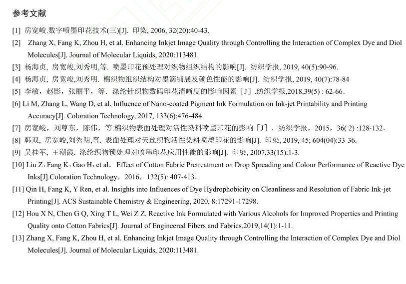【摘要】:為了研究活性染料墨水黏度和表面張力對棉織物印花性能的影響,配制不同黏度和表面張力的活性紅墨水,測試打印后織物的滲透率、K/S值、墨量及打印線寬等指標(biāo)。結(jié)果表明:提高墨水黏度會降低墨滴在織物上的潤濕和滲透性能,打印到織物的墨量減少,打印清晰度下降。不同黏度的墨水對打印線條經(jīng)緯向的清晰度影響機(jī)制不同,表面張力對織物打印性能的影響比黏度小。