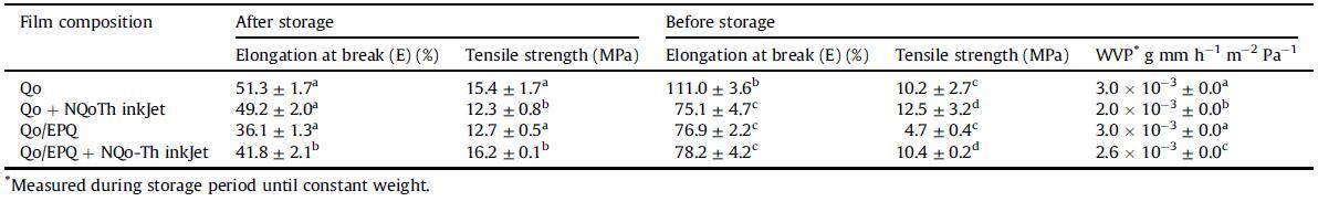 在儲存前后測量了印有4層NQoThs的薄膜的機械性能和WVP,這些結(jié)果如表4所示。