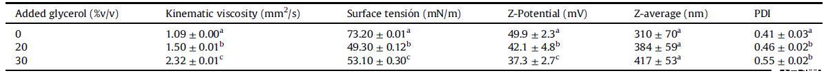表2甘油對納米顆粒懸浮液物理性質(zhì)和納米顆粒的粒徑和zeta電位的影響。不同字母表示顯著差異(p<0.05)。