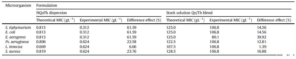 本研究的一個目標是確定對微生物的影響是否是由于組分的協(xié)同或相加作用。通過根據(jù)NQoThs中存在的百分比(QoLMW為75%,Th為25%)對QoLMW和Th的MIC進行加權(quán),將NQoThs的MIC與附加效應(yīng)的估計值進行比較。NPs(NQoTh)和QoLMW/Th原液的MIC值均低于基于組分加和效應(yīng)估計的MIC,表明Qo和Th之間存在協(xié)同效應(yīng)(見表5)。然而,取決于測試的細菌,NPs的MIC比庫存QoLMW/Th混合物低大約1.5到4.5倍。Wazed Ali、Rajendran和Joshi(2011)評估了使用TPP從440-kDa Qo的1.0%(w/v)溶液中產(chǎn)生的NQo(115.5 nm)的AM抗金黃色葡萄球菌。NQo比Qo原液更有效地抑制這些細菌的生長50%。