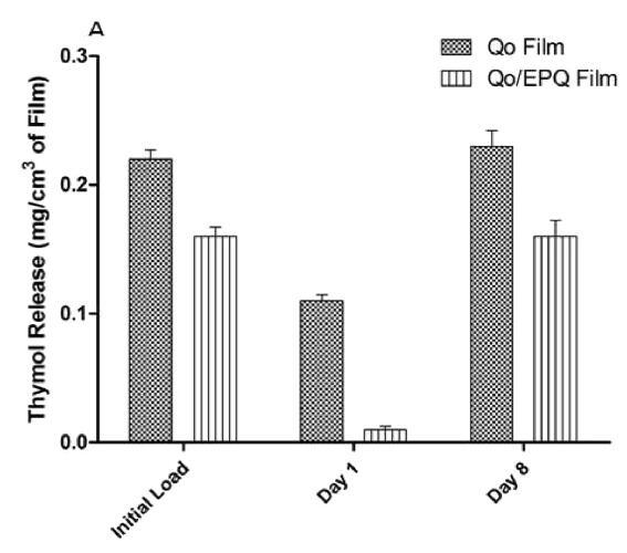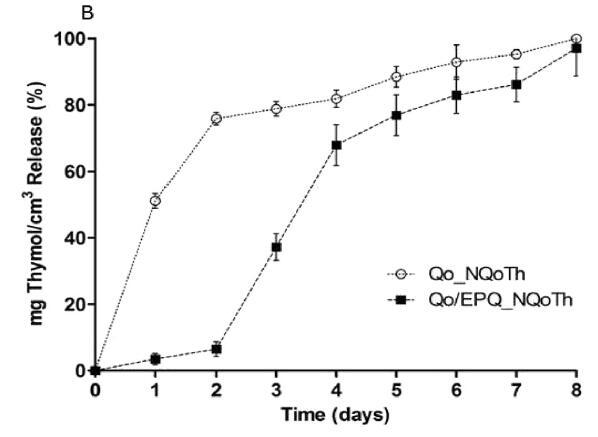 圖6.從使用NQoTh印刷4次的薄膜Qo和Qo/EPQ中釋放百里酚(A)0天(初始負載Th)、第1天和第8天的釋放曲線和(B)室溫下8天測定的百里酚釋放動力學(xué)溫度。