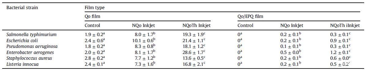 表6通過熱噴墨將NQo和NQoTh結(jié)合到Qo和Qo/EPQ薄膜中的徑向擴散的生長抑制區(qū)(mm2)。對于每種納米顆粒溶液,薄膜印刷4次。不同字母表示顯著差異(p<0.05)。