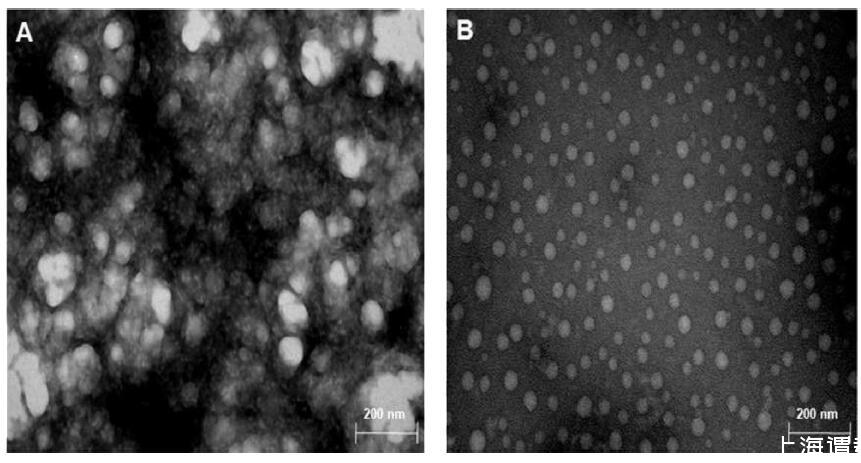圖1.TEM顯微照片NQoTh懸浮液。(A)NPs的分散和(B)添加了甘油(20%w/v)的Nps分散。
