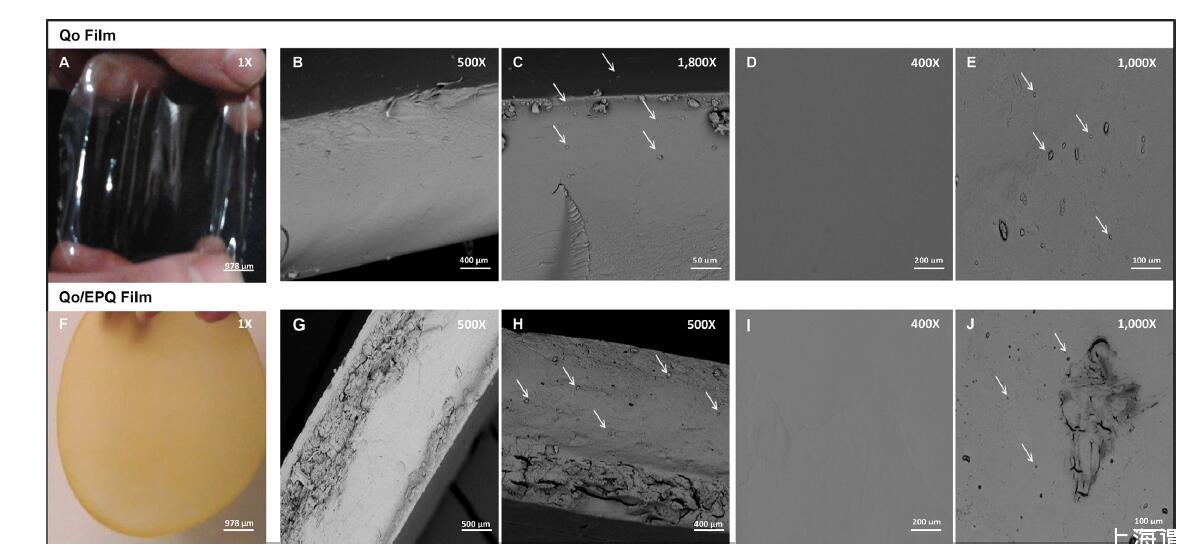 Qo和Qo/EPQ的印刷膜示于圖3A和F。圖3B示出了Qo膜的橫截面,圖3G示出了EPQ/Qo膜的橫截面。Qo膜具有均勻、柔軟、光滑、連續(xù)的結(jié)構(gòu),具有良好的完整性和孔隙。相比之下,混合膜具有帶有孔隙和裂縫的異質(zhì)結(jié)構(gòu)。Qo-乳清蛋白薄膜(Kurek、Galus和Debeaufor,2014年)和Qo-明膠薄膜(Kurek等人,2012年;Rivero、García和Pinotti,2009年;Torres、Aimoli、Beppu和弗雷利希,2005年)。這些作者將這些由碳水化合物和蛋白質(zhì)混合物制備的薄膜的異質(zhì)結(jié)構(gòu)歸因于干燥過程(溶劑前沿的遷移)。Qo/EPQ薄膜的干燥時間是Qo薄膜的1.8倍,表明水分子通過混合薄膜的擴散速度較慢。此外,混合物的pH值(pH 3.8)接近藜麥蛋白的等電點(Abugoch,Romero,Tapia,Rivera,&Silva,2008),這可能會引發(fā)復(fù)雜的凝聚和某些蛋白質(zhì)組分的沉淀,導(dǎo)致Ferreira等人描述的熱力學(xué)不相容性。(2009),當(dāng)乳清蛋白和Qo的混合物被酸化以獲得混合膜時,他觀察到了這種現(xiàn)象。