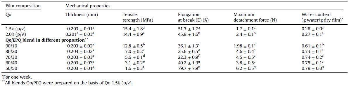 表1殼聚糖薄膜(Qo)和Qo/EPQ混合物(Qo/EPQ)薄膜的機械性能。不同字母表示差異顯著(p<0.05)。