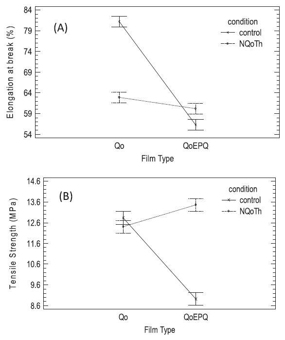 圖5.Type Film和NQoTh之間的相互作用(A)斷裂伸長率效應(yīng)和(B)拉伸強度效應(yīng)。