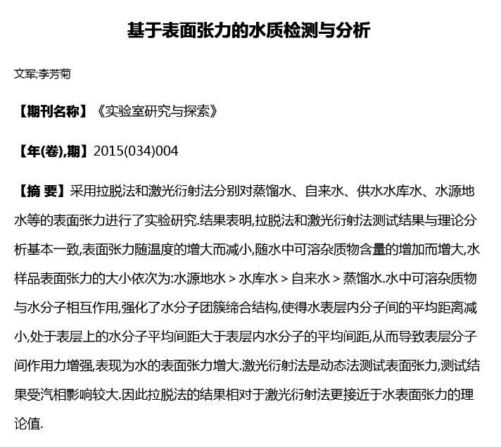 【摘要】:采用拉脫法和激光衍射法分別對蒸餾水、自來水、供水水庫水、水源地水等的表面張力進(jìn)行了實(shí)驗(yàn)研究。結(jié)果表明,拉脫法和激光衍射法測試結(jié)果與理論分析基本一致,表面張力隨溫度的增大而減小,隨水中可溶雜質(zhì)物含量的增加而增大,水樣品表面張力的大小依次為:水源地水水庫水自來水蒸餾水。水中可溶雜質(zhì)物與水分子相互作用,強(qiáng)化了水分子團(tuán)簇締合結(jié)構(gòu),使得水表層內(nèi)分子間的平均距離減小,處于表層上的水分子平均間距大于表層內(nèi)水分子的平均間距,從而導(dǎo)致表層分子間作用力增強(qiáng),表現(xiàn)為水的表面張力增大。激光衍射法是動(dòng)態(tài)法測試表面張力,測試結(jié)果受汽相影響較大。因此拉脫法的結(jié)果相對于激光衍射法更接近于水表面張力的理論值。