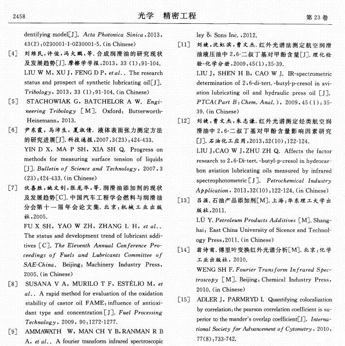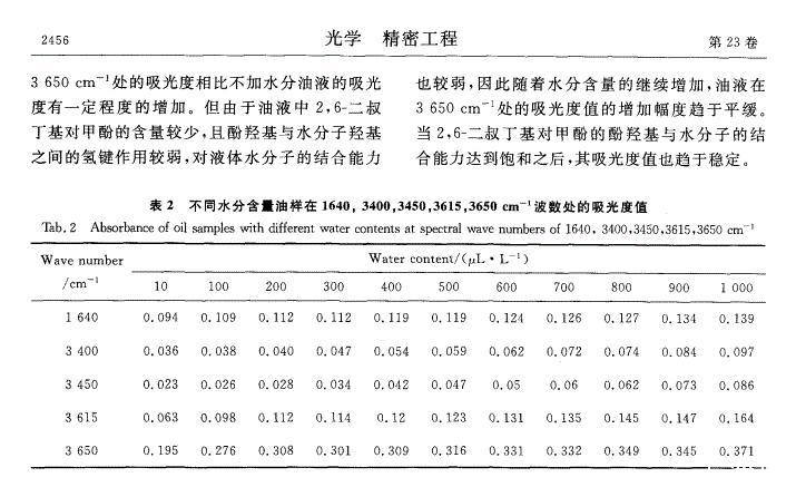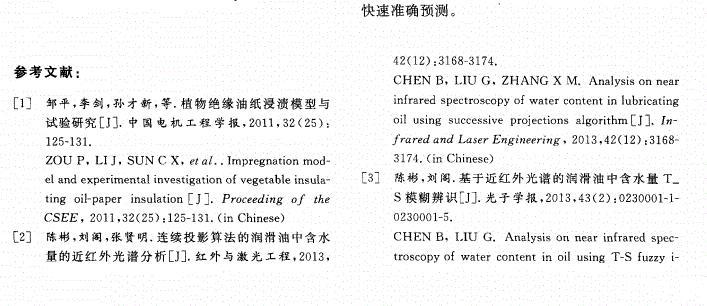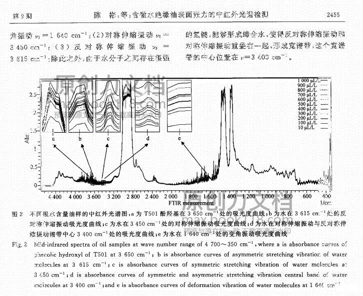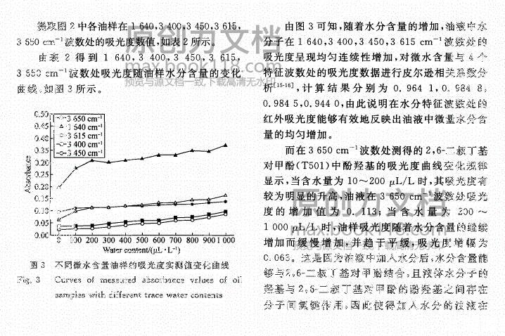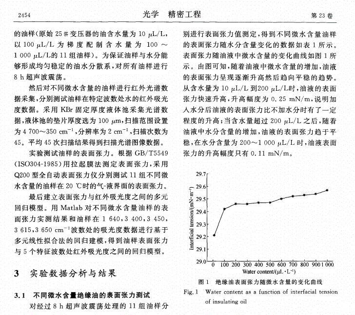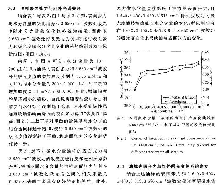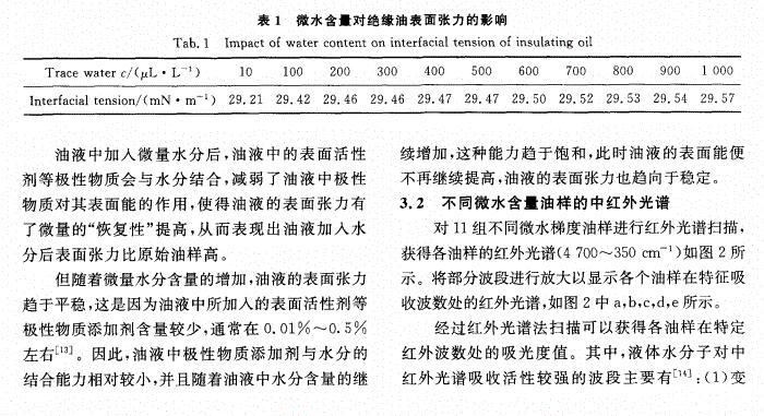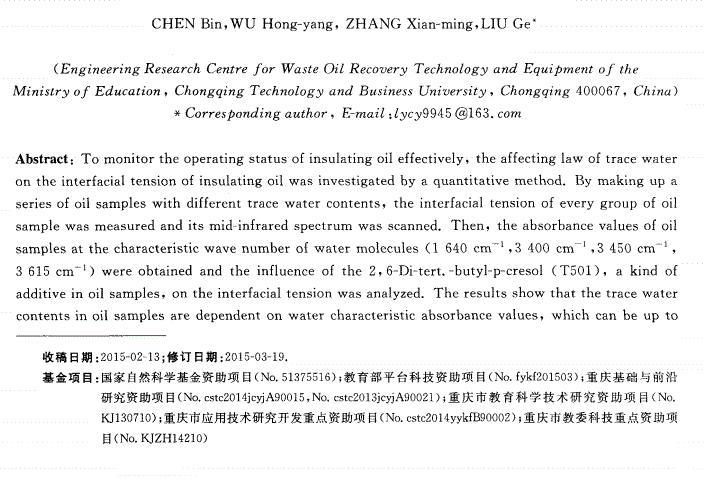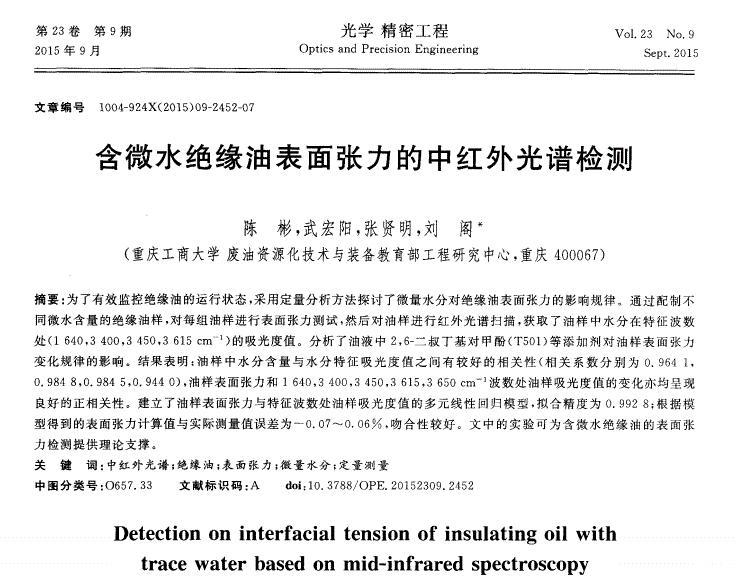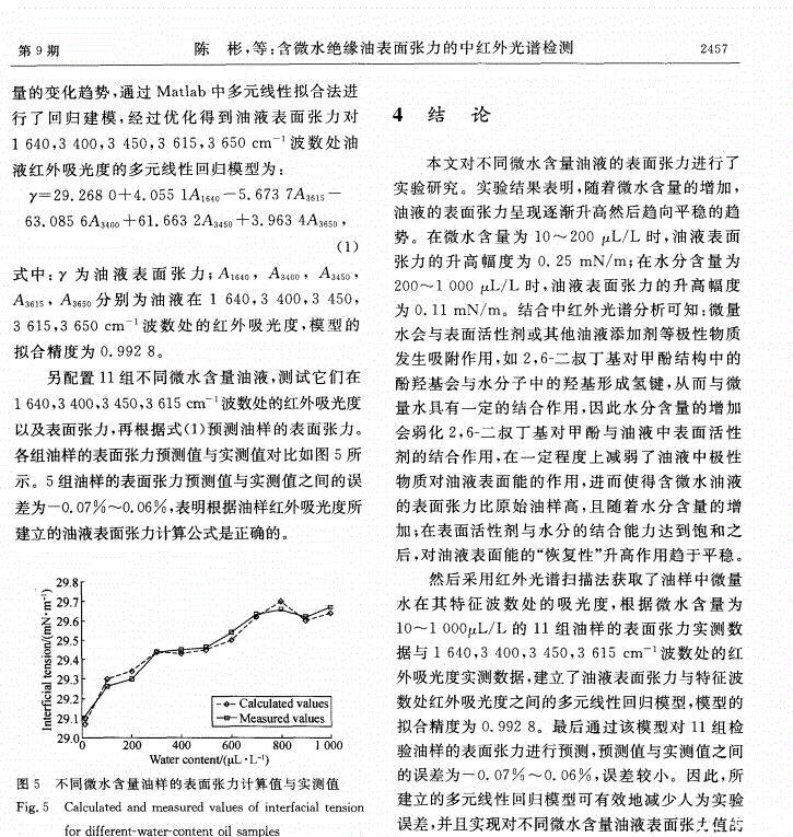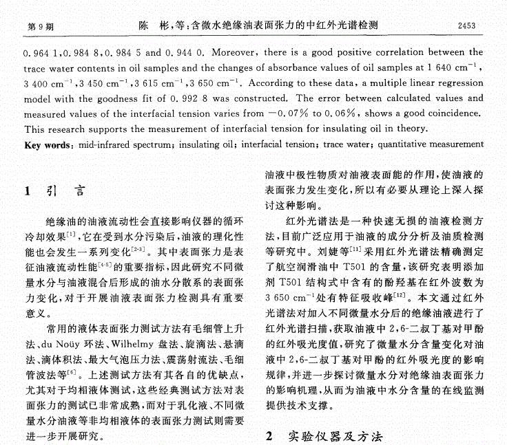 【摘要】:為了有效監(jiān)控絕緣油的運行狀態(tài),采用定量分析方法探討了微量水分對絕緣油表面張力的影響規(guī)律。通過配制不同微水含量的絕緣油樣,對每組油樣進行表面張力測試,然后對油樣進行紅外光譜掃描,獲取了油樣中水分在特征波數(shù)處(1 640,3 400,3 450,3 615cm-1)的吸光度值。分析了油液中2,6-二叔丁基對甲酚(T501)等添加劑對油樣表面張力變化規(guī)律的影響。結果表明:油樣中水分含量與水分特征吸光度值之間有較好的相關性(相關系數(shù)分別為0.964 1,0.984 8,0.984 5,0.944 0),油樣表面張力和1 640,3 400,3 450,3 615,3 650cm-1波數(shù)處油樣吸光度值的變化亦均呈現(xiàn)良好的正相關性。建立了油樣表面張力與特征波數(shù)處油樣吸光度值的多元線性回歸模型,擬合精度為0.992 8;根據(jù)模型得到的表面張力計算值與實際測量值誤差為-0.07~0.06%,吻合性較好。文中的實驗可為含微水絕緣油的表面張力檢測提供理論支撐。