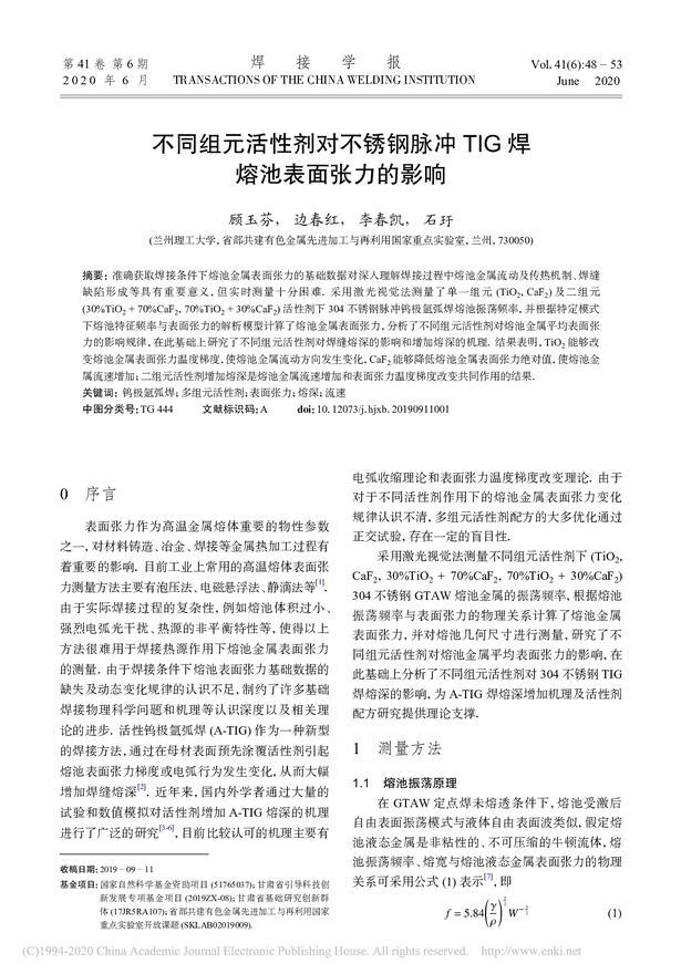 不同組元活性劑對(duì)不銹鋼脈沖TIG焊熔池表面張力的影響
