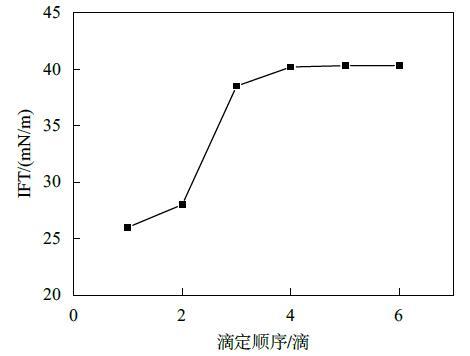 結(jié)果表明,液滴懸置5 min后,第一滴液滴表面張力值最小,隨著連續(xù)滴定的進(jìn)行,液滴表面張力值逐漸增大,最終趨于平衡。究其原因,可能是由于懸置一段時(shí)間后,表面活性劑分子在表面充分吸附,所以第一滴液滴表面張力最小,而隨著連續(xù)滴定進(jìn)行,由于平衡時(shí)間較短,表面活性劑分子在液滴的表面吸附未達(dá)平衡,所以數(shù)值逐漸增大,然而滴加液滴的速度一定,表面活性劑分子在表面的遷移速率一定,降低表面的能力與效率一定,最終會達(dá)到一個(gè)穩(wěn)定值。而平衡時(shí)間的長短,與表面活性劑分子的性質(zhì)有關(guān),遷移吸附速率快的表面活性劑分子所需時(shí)間較短。由此可見,使用懸滴法測定表面張力時(shí),時(shí)間效應(yīng)的影響不可忽略。