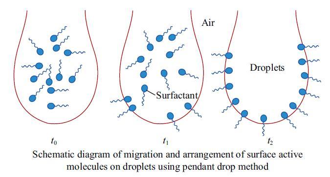 結(jié)果表明,在動態(tài)表面張力曲線圖中,A,B,C三種樣品在60 mg/kg的較低含量下,表面張力均呈現(xiàn)先快速降低而后緩慢降低最終達(dá)到平衡的趨勢,表明表面活性劑分子在液滴表面上確實(shí)存在著隨時(shí)間變化逐漸吸附平衡,排列完整的現(xiàn)象,如圖4所示,表面活性劑分子在表面完全吸附、排列緊密需要一定的時(shí)間,顯然在使用懸滴法進(jìn)行測定時(shí),時(shí)間效應(yīng)直接影響著表面張力測定的誤差大小,符合前文所述結(jié)論。而樣品B在100 mg/kg含量下,動態(tài)表面張力趨勢圖成一條直線,證明該種表面活性劑在液滴表面遷移速度較快,在液滴完全注射形成之前已快速到達(dá)平衡狀態(tài),表面活性劑分子在表面得以充分排布,這解釋了較低含量的表面活性劑溶液的靜態(tài)表面張力與國標(biāo)推薦方法吻合程度差異較大的原因。這是由表面活性劑分子自身性質(zhì)所決定的,與其極性基的類型、結(jié)構(gòu)、個(gè)數(shù)、疏水基長度等息息相關(guān)。而單一液體,未具有含量差,故不存在表面活性劑分子從溶劑內(nèi)部遷移吸附至表面這一過程,所以其動態(tài)表面張力曲線呈現(xiàn)為平穩(wěn)直線。