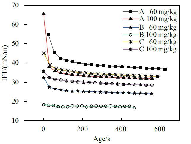 為了充分證明時(shí)間效應(yīng)對懸滴法測定結(jié)果會造成影響,實(shí)驗(yàn)使用懸滴法對A,B,C三種表面活性劑復(fù)配溶液較稀含量下的動態(tài)表面張力進(jìn)行了研究。結(jié)果如圖3所示。