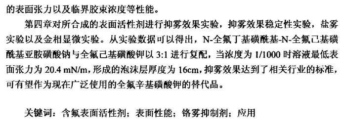 第四章對所合成的表面活性劑進(jìn)行抑霧效果實(shí)驗(yàn),抑霧效果穩(wěn)定性實(shí)驗(yàn),鹽霧實(shí)驗(yàn)以及金相顯微實(shí)驗(yàn)。從實(shí)驗(yàn)數(shù)據(jù)可以得出,N-全氟丁基磺?;?N-全氟己基磺酰基亞胺磺酸鈉與全氟己基磺酸鉀以3:1進(jìn)行復(fù)配,當(dāng)濃度為1/1000時(shí)溶液最低表面張力為20.4mN/m,形成的泡沫層厚度為16cm,抑霧效果達(dá)到了相關(guān)行業(yè)的標(biāo)準(zhǔn),可有望作為現(xiàn)在廣泛使用的全氟辛基磺酸鉀的替代品。