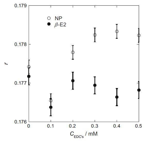 RB 分子在膠束表面區(qū)域溶解得越硬,r 值越大[15]。 r 值的變化如圖 3 所示。在 0.1 mM 時(shí),r 值下降。 這表明 EDCs 開始溶解到膠束中擾亂了 RB 分子在膠束表面的緊密堆積。 隨著NP濃度的增加,r值增加。 然而,隨著β-E2濃度的增加,r值一度恢復(fù)并似乎一點(diǎn)點(diǎn)下降。 這表明 NP 的增溶使膠束表面更加剛性,而 β-E2 的增溶則沒有。 NP在結(jié)構(gòu)上更類似于HTA+。 因此,NP在膠束中的HTA+離子頭之間增溶,降低了膠束表面離子頭的靜電斥力,使膠束更加穩(wěn)定和剛性[16]。 另一方面,β-E2 似乎會(huì)干擾 HTA+ 的取向并降低膠束表面的剛度。