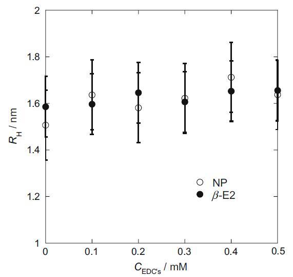 我們在每個(gè) EDC 存在下通過動(dòng)態(tài)光散射方法研究了 HTA+ 膠束的 RH(圖 4)[17]。 隨著 EDCs 濃度的增加,膠束的流體動(dòng)力學(xué)半徑似乎逐漸增加。