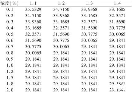 由表3可以看出復(fù)配液的表面張力在同配比的情況下,表面張力隨濃度增大而降低;不同配比時(shí),隨著配比的增大表面張力降低、cmc降低、但σcmc不變。