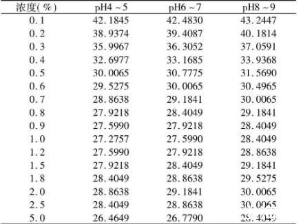 配制不同濃度的黃花敗醬皂甙水溶液并在不同溫度對(duì)其表面張力進(jìn)行研究及pH對(duì)其影響。結(jié)果如下。