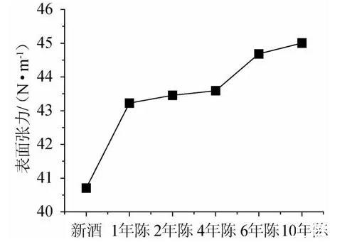 采用表面張力評價黃酒隨陳釀時間的變化,結(jié)果表明,黃酒的表面張力隨著陳釀時間整體呈上升趨勢,黃酒的表面張力與陳釀時間具有顯著的高度正相關(guān)關(guān)系。
