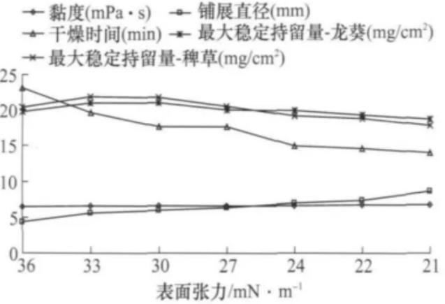 改變草甘膦藥液的表面張力,其生物活性最佳區(qū)間是表面張力在22~24mN/m,藥液的黏度在6.58~6.7mPa·s之間,液滴的鋪展直徑在7~7.4mm,干燥時間在14.52~14.98min,龍葵和稗草葉片表面的最大穩(wěn)定持留量分別在19.23~19.86、18.72~19.16mg/cm2之間,對龍葵和稗草的目測防效最高可增加42%和37%左右,鮮重防效最高可增加41%和37%。通過改變草甘膦藥液的黏度,其最佳活性區(qū)間為黏度超過14.5mPa·s,表面張力低于31.5mN/m,液滴的鋪展直徑達到4.83mm,干燥時間低于21.49min,龍葵的最大穩(wěn)定持留量超過23.18mg/cm2,稗草的最大穩(wěn)定持留量超過25.10mg/cm2,對龍葵和稗草的目測防效都可提高42%,鮮重防效可提高42%和41%。