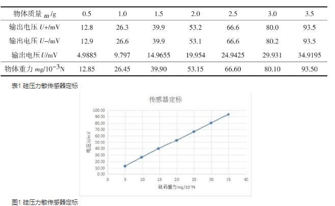 為了減小人為誤差,對于力敏傳感器的靈敏度的測量采用先依次增加砝碼片個(gè)數(shù),測出相應(yīng)電壓用U+表示,再依次減小砝碼片個(gè)數(shù),測出相應(yīng)電壓用U-表示,然后再將電壓取平均值。測量數(shù)據(jù)如下,太原地區(qū)的重力加速度為9.7970 m/s2。由圖1得傳感器的靈敏度為B=2.6792 V/N,線性相關(guān)系數(shù)R2=0.9999。