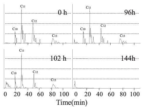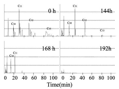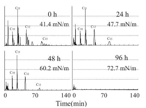 生物降解過程中10mg/L LAS的色譜圖,通過HPLC使用UV檢測器進行分析,如圖6所示。在相應的保留時間(RT)處出現(xiàn)不同碳鏈數(shù)的峰組:16至19.5分鐘為C10,26.5至32.5分鐘是C11,44到55分鐘是C12,74到95分鐘是C13。 由于苯基的結(jié)合位置不同,每個峰組都包含異構體峰。 參考標準(和光純藥工業(yè)株式會社)用于識別每個峰。