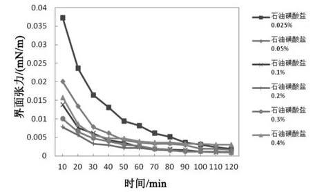 圖1不同石油磺酸鹽濃度下體系界面張力隨時間變化規(guī)律