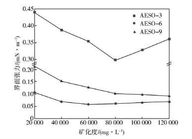 從圖2可以看出,隨著礦化度的增加,AESO-3的界面張力先降低后升高,AESO-6和AESO-9界面張力降低到平衡值后基本保持穩(wěn)定,在礦化度達(dá)到120 000 mg/L時(shí)界面張力仍能達(dá)到10-2mN/m數(shù)量級,這說明EO聚合度的增加提高了脂肪醇聚醚磺酸鹽的耐鹽性能。這一現(xiàn)象可以用無機(jī)鹽對表面活性劑在溶液中的聚集形態(tài)的影響來解釋[15]。通常表面活性劑中的雙親基團(tuán)各自趨向于自身親和力強(qiáng)的溶液中,在油水界面規(guī)則排列形成一層親水基向外、憎水基向內(nèi)的薄層,溶液中濃度達(dá)到一定時(shí),表面活性劑分子發(fā)生聚集形成膠束。加入適量無機(jī)鹽,無機(jī)鹽正離子受靜電作用會在親水基附近聚集能夠降低親水基之間的靜電排斥、改變表面活性劑在界面的堆積形態(tài),從而降低油水界面張力;隨著無機(jī)鹽濃度繼續(xù)增大,無機(jī)鹽離子對表層進(jìn)一步壓實(shí),油相無法進(jìn)入膠束中導(dǎo)致界面張力增大。而對于非離子-陰離子表面活性劑,中性親水基團(tuán)EO的引入減弱了無機(jī)鹽對界面親水基的靜電作用,從而使其在礦化度較高的時(shí)候仍然能夠保持良好的界面活性。