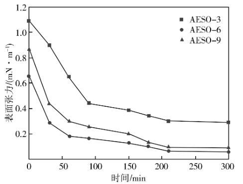 由圖1可以看出,隨著測試時(shí)間的推移,脂肪醇聚醚磺酸鹽與煤油之的界面張力逐漸減小并趨于穩(wěn)定。3種表面活性劑界面張力隨聚合的增大先減小后增大,其中AESO-3界面張力值最大,AESO-6界面張力值最小為6.03×10-2mN/m。