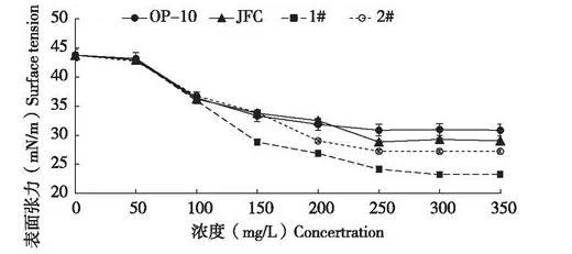 農(nóng)藥制劑噴霧使用時(shí),藥液的表面張力會(huì)影響到藥液在植物葉片上的潤(rùn)濕性能和持留量,很多藥液難以在水稻、小麥和甘藍(lán)葉面濕潤(rùn)展布,是由于藥液的表面張力大于這些植物的臨界表面張力,因此要選用能顯著降低表面張力的表面活性劑,或增加表面活性劑的用量,使藥劑推薦劑量藥液的表面張力值小于水稻的臨界表面張力值,才能有利于藥液在水稻等葉面上的濕潤(rùn)。本研究中發(fā)現(xiàn),2.3%甲維鹽微乳劑在推薦使用倍數(shù)下,對(duì)應(yīng)藥液表面張力43.8 mN/m明顯高于水稻的臨界表面張力36-38 mN/cm,表現(xiàn)為藥液在葉片上難潤(rùn)濕展布,因此本文通過添加4種助劑來降低藥液表面張力,當(dāng)藥液表面張力低于靶標(biāo)作物葉面表面張力時(shí),藥液才能在葉面潤(rùn)濕展布,提高噴霧藥液的持留量和鋪展面積,綜合考慮,4種助劑表現(xiàn)最優(yōu)是乳化劑1#,其次是乳化劑2#,然后是JFC,OP-10表現(xiàn)最差。