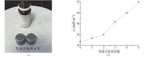 圖1典型的表面張力測(cè)試照片(a)及等離子處理次數(shù)與涂層表面張力的關(guān)系(b)