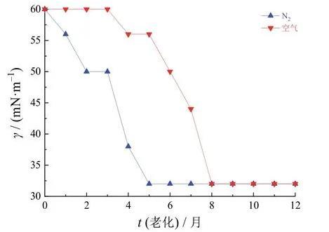 將納米涂層放置在室溫條件下自然老化12個(gè)月,每隔一個(gè)月測(cè)試一次表面張力。由圖2可知,老化前涂層的表面張力均為60 mN/m,其中,空氣條件下等離子處理的涂層的表面張力在前3個(gè)月內(nèi)無變化,4個(gè)月后降為56 mN/m且保持了1個(gè)月左右,6個(gè)月后降為50 mN/m,7個(gè)月后降為45 mN/m,8個(gè)月后降幅最大,降至僅有32 mN/m,之后的4個(gè)月基本保持在這一水平。對(duì)于以氮?dú)鉃闅庠吹入x子處理的涂層,其表面張力在1個(gè)月后降為56 mN/m,2個(gè)月后降為50 mN/m且保持了1個(gè)月左右,4個(gè)月后降幅最大,降至38 mN/m,5個(gè)月后再降至32 mN/m,之后的7個(gè)月基本保持在這一水平。納米涂層以空氣等離子處理后的表面張力在前8個(gè)月的下降幅度明顯小于氮?dú)獾入x子處理的涂層。根據(jù)行業(yè)經(jīng)驗(yàn),涂層要滿足粘接性能的話,其表面張力一般需要≥34 mN/m,≥38 mN/m則幾乎可以滿足所有粘接需求。以空氣作為氣源等離子處理后的7個(gè)月內(nèi)涂層的表面張力仍大于40 mN/m,因此可以滿足實(shí)際應(yīng)用需求,而且優(yōu)于以氮?dú)庾鳛闅庠吹奶幚硇Ч?
