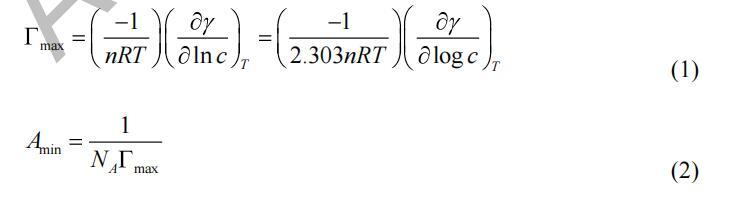 通過分析平臺(tái)獲得最小表面張力(γCMC)值 地塊的區(qū)域。 確定臨界膠束濃度 (CMC) 值 從表面張力的斷點(diǎn)與濃度的對(duì)數(shù) 曲線。 最大表面過量濃度(Γmax)和最小表面積 (Amin) 在空氣/水界面被每個(gè)表面活性劑分子占據(jù)的計(jì)算公式為 吉布斯吸附方程: