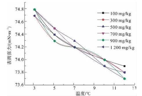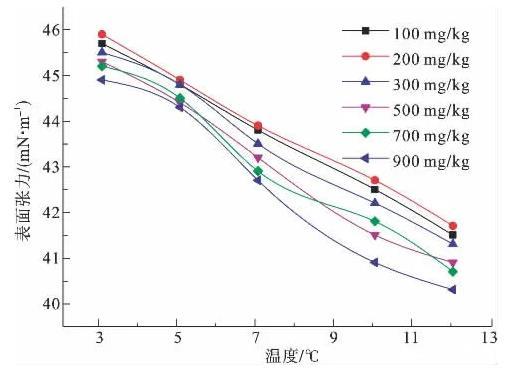 圖6為100、200、300、500、700、900 mg/kg濃度下,非離子表面活性劑P123溶液的表面張力隨溫度變化示意圖。由圖6可知,隨濃度增大,溶液降低表面張力的能力逐漸增大,但各個(gè)濃度曲線差值不大,900 mg/kg濃度溶液表面活性最強(qiáng)。在所測(cè)溫度范圍內(nèi),整體上表面張力曲線幾乎呈直線狀,遵循隨溫度升高而表面張力降低的一般規(guī)律,斜率幾乎不變,未出現(xiàn)拐點(diǎn),且相差較大,同一條曲線3℃和12℃表面張力值相差4.2~4.6 mN/m。