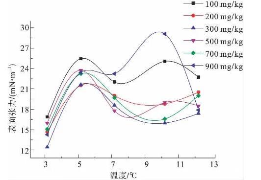圖5為100、200、300、500、700、900 mg/kg濃度下,陰離子表面活性劑CTAB溶液的表面張力隨溫度變化示意圖。由圖5可知,300 mg/kg溶液的表面張力曲線最低,說明該濃度的溶液表面活性最強(qiáng)。在所測(cè)溫度范圍內(nèi),隨溫度升高表面張力變化較大,整體上表面張力曲線呈波浪狀,出現(xiàn)拐點(diǎn)。6條曲線在3℃時(shí)均出現(xiàn)最低表面張力值,在5℃附近均出現(xiàn)波峰;100、500和900 mg/kg溶液在7℃附近時(shí)出現(xiàn)波谷,10℃附近再次出現(xiàn)波峰;200、300和700 mg/kg溶液在10℃附近出現(xiàn)波谷。