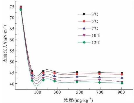 圖2為3、5、7、10、12℃下,陰離子表面活性劑CTAB溶液的表面張力隨濃度變化示意圖。由圖2可知,CTAB是比較優(yōu)良的表面活性劑,在低濃度下就能夠顯著降低溶液表面張力,在300 mg/kg-1時(shí)表面張力達(dá)到最低值,之后隨濃度增大,表面張力變化不大,因此CTAB的臨界膠束濃度CMC即在此濃度范圍附近。在所測(cè)溫度范圍內(nèi),當(dāng)CTAB溶液達(dá)到CMC以后,表面張力值在14.5~23.5 mN/m之間。隨溫度變化,表面張力值相差較大。