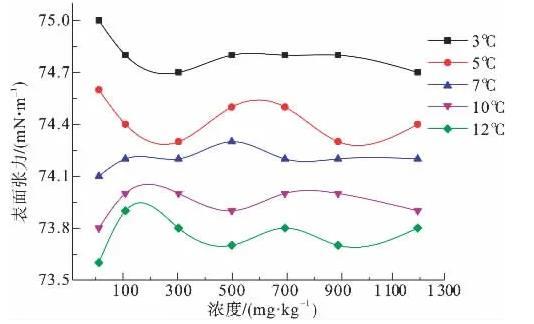 圖3為3、5、7、10、12℃下,非離子型表面活性劑P123溶液的表面張力隨濃度變化示意圖。由圖3可知,P123在低濃度下就能夠顯著降低溶液表面張力,在400 mg/kg時(shí)表面張力達(dá)到最低值,之后隨濃度增大,表面張力變化不大,因此CTAB的臨界膠束濃度CMC即在此濃度范圍附近。在所測(cè)溫度范圍內(nèi),當(dāng)P123溶液達(dá)到CMC以后,表面張力值在40.5~45.5 mN/m之間。隨溫度變化,表面張力值相差較大。