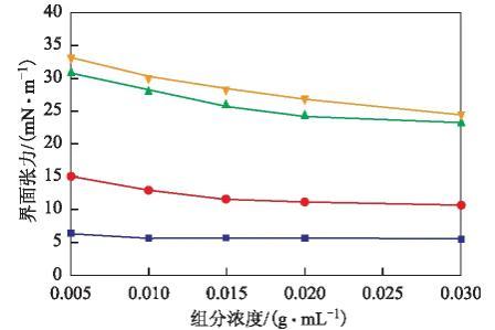 分別以380號燃料油中四組分為溶質(zhì),甲苯與正十二烷混合物為溶劑,配制不同濃度的模擬油,以去離子水為水相,測定了各模擬油的油水界面張力,結(jié)果見圖1。從圖1可以看出,不同組分模擬油的油水界面張力由大到小的順序為飽和分>芳香分>膠質(zhì)>瀝青質(zhì)。由界面張力理論可知,界面張力越小,表明組分在油水界面的吸附速率和吸附量越大,界面活性越強[13],因此380號燃料油中四組分的界面活性由大到小的順序為瀝青質(zhì)>膠質(zhì)>芳香分>飽和分。這與原油中四組分的界面活性順序一致。