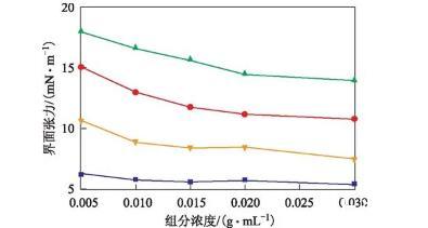 圖1 380號燃料油中四組分的油水界面張力曲線飽和分;▲—芳香分;●—膠質(zhì);■—瀝青質(zhì)