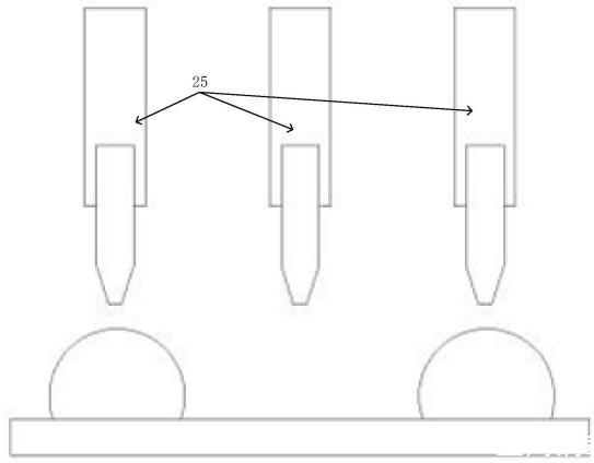 步驟S3:通過(guò)印刷機(jī)構(gòu)將摻入碳粉并通入正電荷的UV油墨鋪滿(mǎn)在紙張上,由于紙張上已覆蓋有固化的UV涂層,因此UV油墨在紙張上仍可自由移動(dòng),此時(shí)通過(guò)計(jì)算機(jī)處理印刷圖案,進(jìn)而控制印刷機(jī)構(gòu)向指定金屬探針輸送負(fù)電荷,其余金屬探針輸送正電荷,當(dāng)金屬探針接觸帶正電荷UV油墨時(shí),通過(guò)異電荷相互吸附的原理,UV油墨將向金屬探針聚攏;其余探針通過(guò)同電荷相互排斥的原理,UV油墨將向金屬探針?lè)捶较蛱右?,待金屬探針收回,UV油墨將因表面張力短時(shí)間內(nèi)無(wú)法流平,再對(duì)紙張表層所有UV油墨進(jìn)行最終固化;