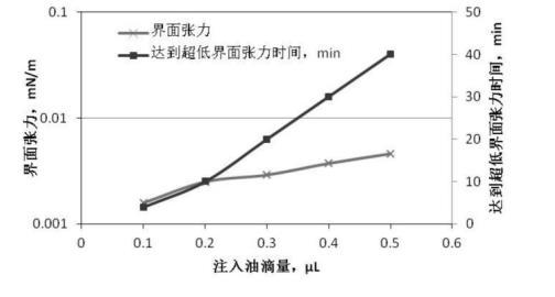 圖3、圖4是根據(jù)前述實(shí)驗(yàn)步驟1、2提供的配置與測量方法,油滴注入量分別為0.1μL、0.2μL、0.3μL、0.4μL、0.5μL,無堿二元驅(qū)配方體系與高凝油間界面張力的關(guān)系曲線。從圖2可知:無堿二元驅(qū)配方體系與高凝油間的界面張力達(dá)到超低界面張力的時間隨著油滴注入量的增多明顯延長,注入油滴0.1μL,4分鐘達(dá)到超低界面張力,注入油滴0.5μL,40分鐘達(dá)到超低界面張力;從圖4可知:注入油滴量大于0.3μL以后,對無堿二元驅(qū)配方體系與高凝油間界面張力的測定不能持續(xù)2小時,油滴在100分鐘發(fā)生斷開,對于高凝油而言,油滴注入量小于0.3μL較適合。
