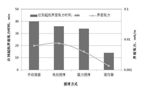 mN/m;手動混搖的方式達(dá)到超低界面張力的時間最長,為40分鐘,電動攪拌和磁力攪拌差別不大。混勻器攪拌方式使溶液能在短時間內(nèi)達(dá)到均相且均相程度高,均相程度越高,達(dá)到超低界面張力的時間越短。
